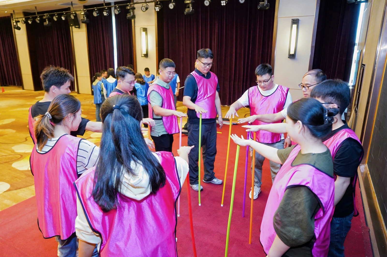 不倒森林:每位成员用手掌稳定塑料棒,合作形成稳固圆圈,培养耐心与协作意识。